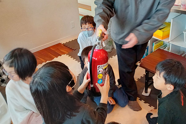 今年は避難訓練の前に、本物の消火器を見せながら使い方の説明を行いました。